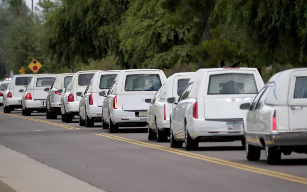 The 10 white caskets belonging to three generations of a Mexican immigrant family were arranged in two rows facing the altar at St. Patrick Catholic Church in Scottsdale, each bearing a metal crucifix inside its satin-lined lid.
