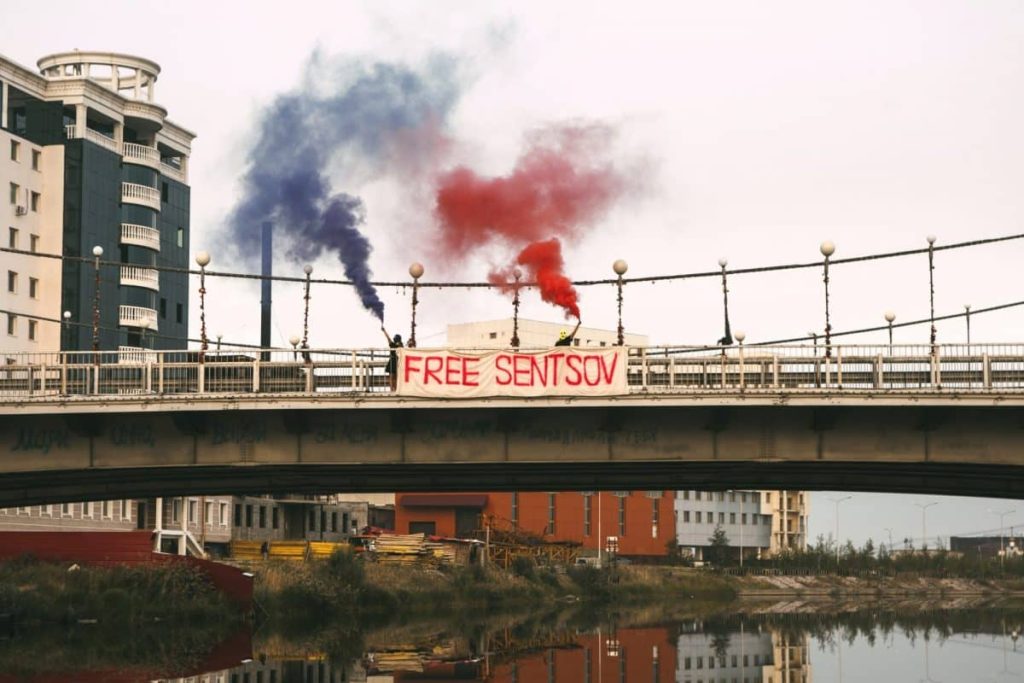 The band members staged a protest Sunday outside the prison colony in Siberia’s Yakutia where Oleg Sentsov is serving his sentence, unfurling a banner on a nearby bridge that read “Free Sentsov!”