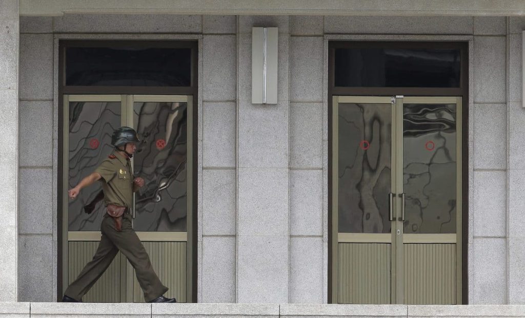 On Wednesday, a handful of tall South Korean soldiers — chosen to intimidate nearby North Korean troops — stood rigidly, gazing toward the North through darkened sunglasses. A lone North Korean soldier stood at attention in front of a North Korean building and another used binoculars to peer from a window into the South.