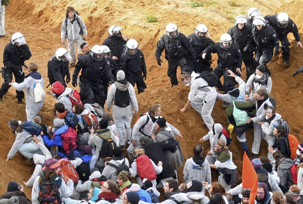 The dpa news agency reported Sunday that a large group of the initial protesters split off to march on the mining site behind a banner reading “We Are Nature Defending Itself.”