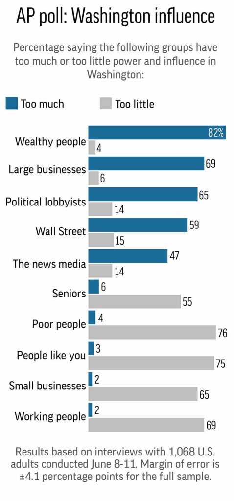 Three-quarters of Americans agree that people like themselves have too little influence in Washington, rare unanimity across political, economic, racial and geographical lines and including both those who approve and disapprove of President Donald Trump, according to a new poll by The Associated Press-NORC Center for Public Affairs Research. Majorities also don’t have a great deal of confidence in most of the nation’s institutions. That’s especially true of Congress, which takes the biggest hit, and the presidency.
