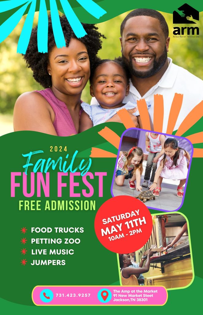 Jackson, Tennessee – Area Relief Ministries will host its seventh annual Family Fun Fest at the AMP at the Market, 91 New Market Street, in downtown Jackson Saturday, May 11, 2024, from 10 a.m. until 2 p.m. Admission is free and families are encouraged to bring lawn chairs for a day of live music, food trucks, a petting zoo, jumpers and more.