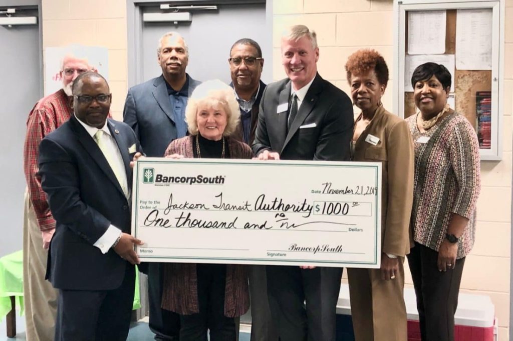 (PHOTO: Doug Roth, BancorpSouth – Jackson market president, third from right – presents a $1,000 check to the Jackson Transit Authority for FREE RIDE DAY)
