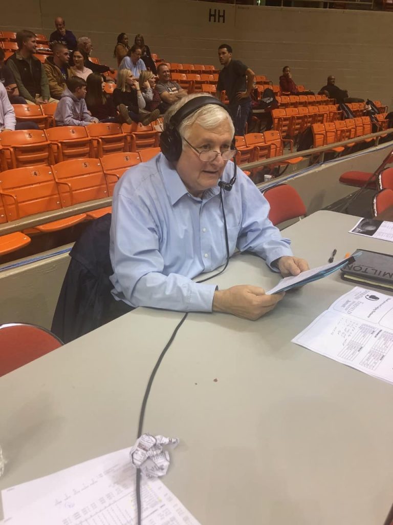 (PHOTO: Jackson businessman Bill Hamilton works play-by-play during the NAIA Women’s Basketball Invitational – courtesy Zachary O’Kelley, Bethel University sports information)