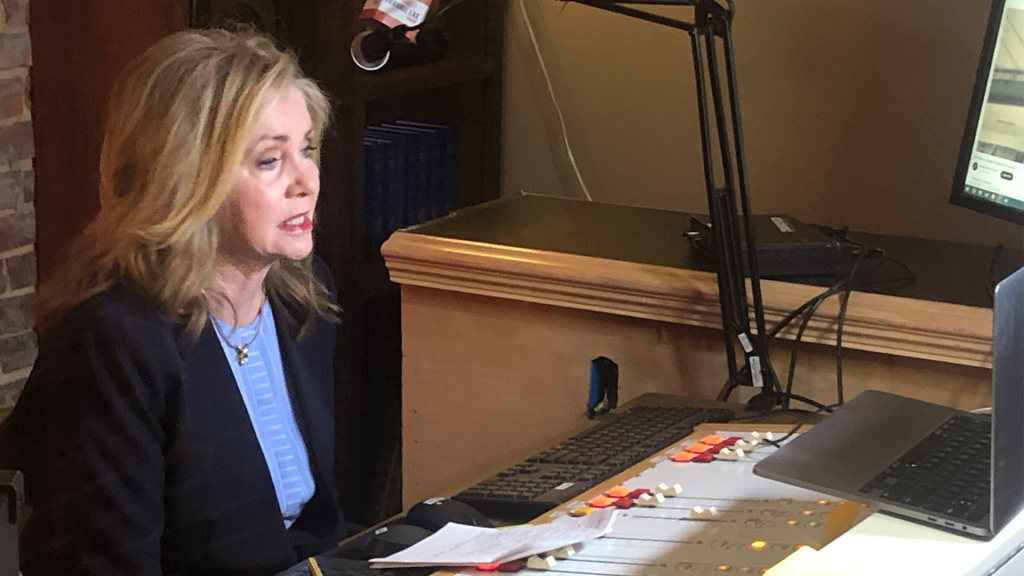 (PHOTO: Sen. Marsha Blackburn is interviewed on the Fox News Channel from the SuperTalk 93.1 FM studio in downtown Jackson.)