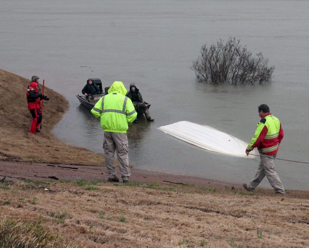 (PHOTO: Rescue personnel on Monday morning recover a boat near the Tennessee River bridge at Savannah. The boat was used by a missing Obion County high school fishing team. TWRA says family members of the two missing teens and one adult have been notified of the situation – courtesy the Courier, Savannah)