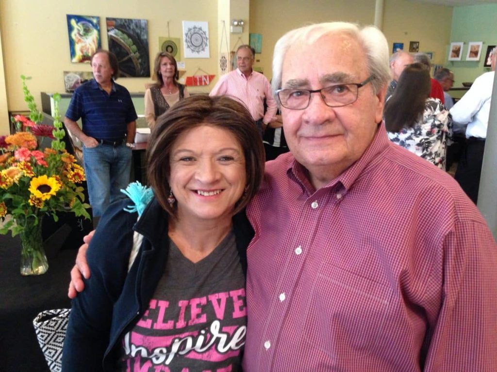 (PHOTO: Bobby Greene, right, visits with Connie Cross, who worked for him at Old Country Auto)
