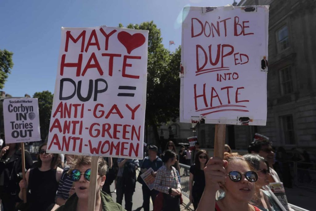 May is under pressure after the Conservatives lost their parliamentary majority in Thursday’s election. The party is seeking support from Northern Ireland’s Democratic Unionist Party to stay in power.