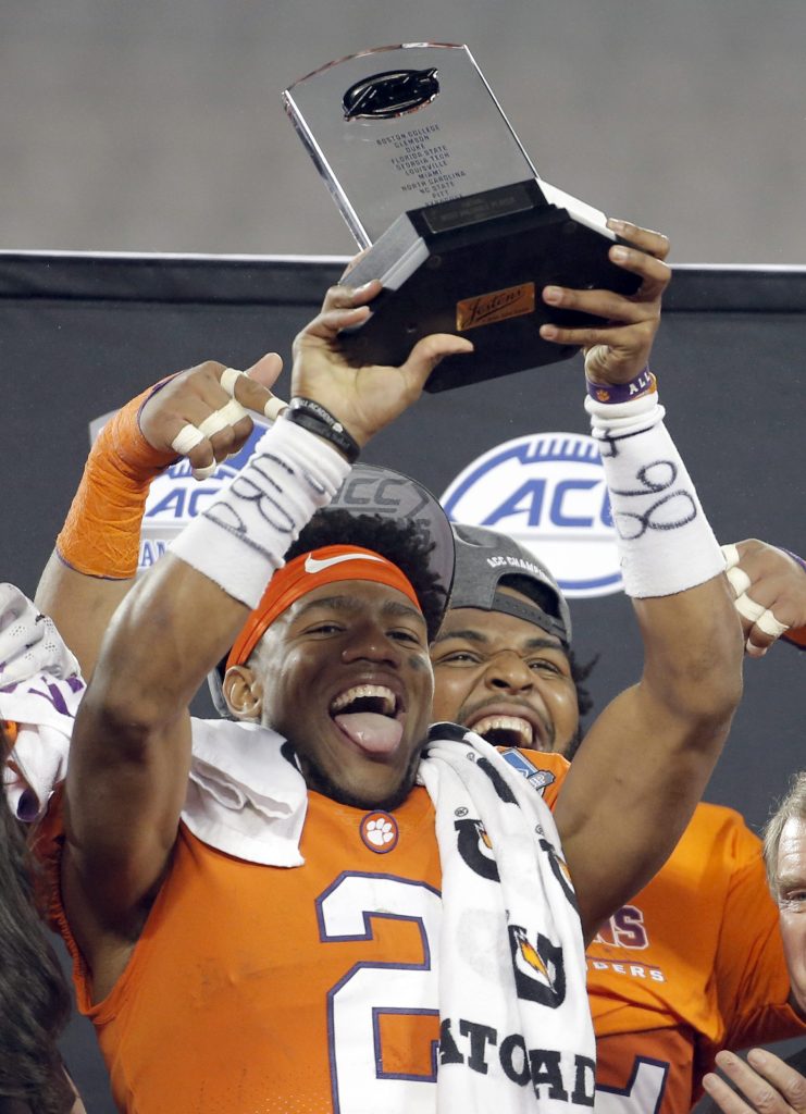 The Tigers set an ACC championship game mark with four different players scoring rushing touchdowns. Along with TDs by Etienne and Bryant, Clemson’s Adam Choice had a 1-yard scoring run and Tavien Feaster had an 11-yard scoring run.