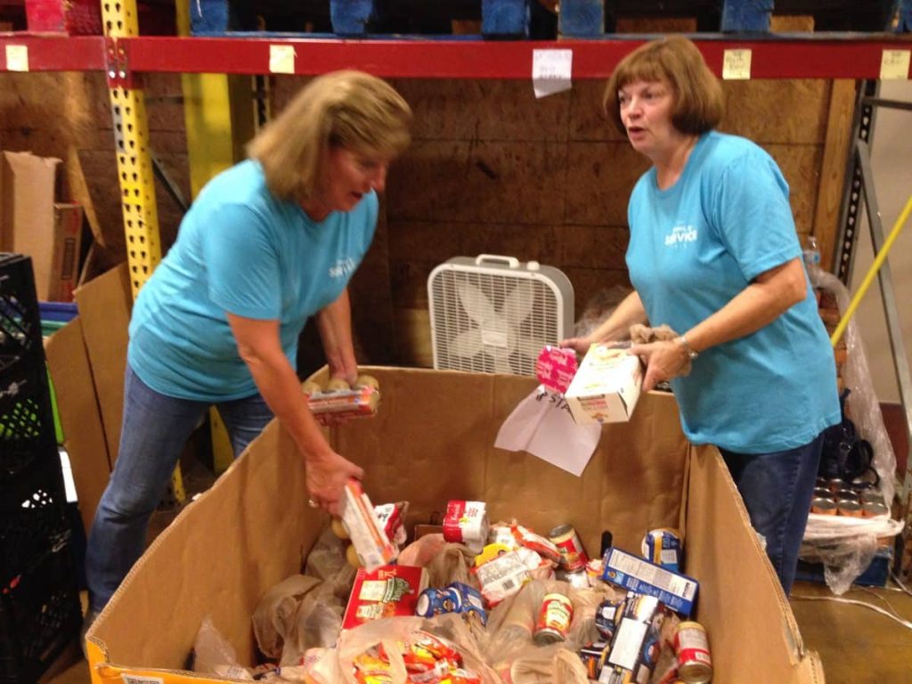 (PHOTO: Janie Moore, left, and Carol Dix sort items at RIFA for the non-profits snack backpack program)