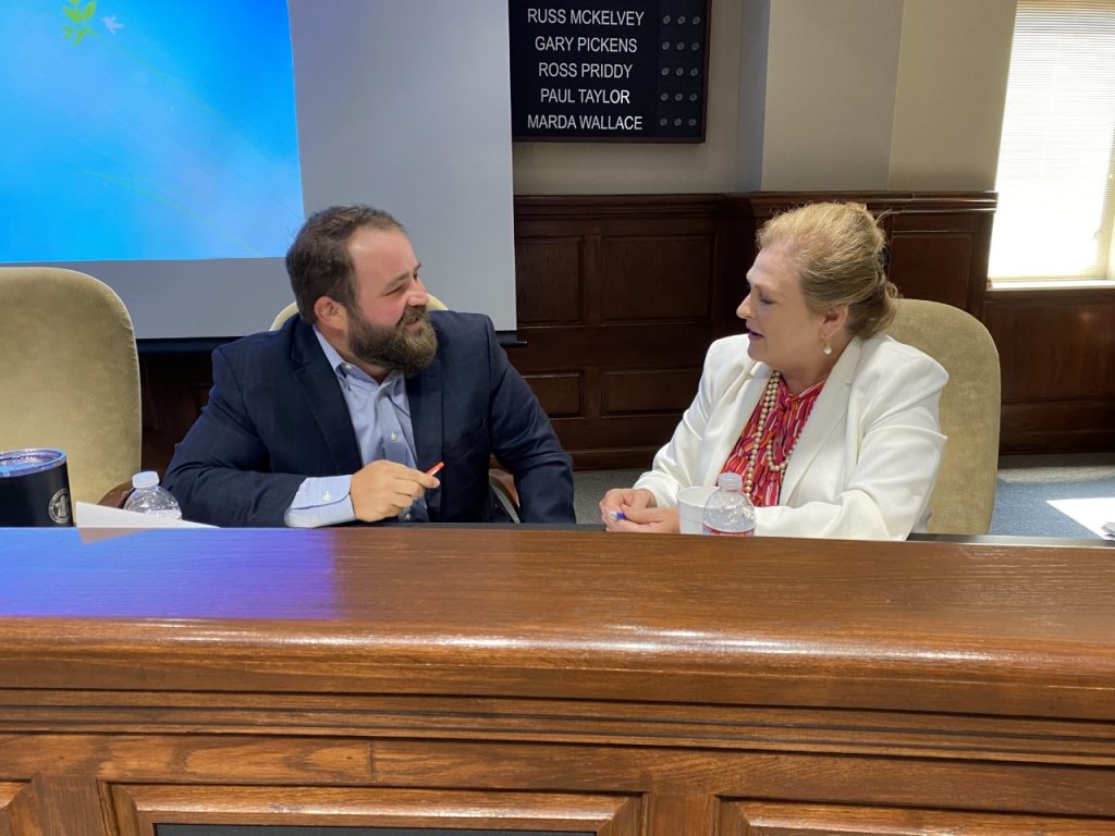 (PHOTO: Paul Taylor, left, talks with fellow council member Marda Wallace – District 7 – following the Jackson City Council meeting, Tuesday)