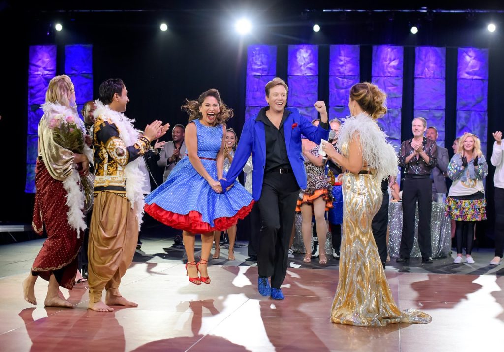 Local celebrities and community advocates perform a choreographed dance routine in front of a panel of judges and a room full of their friends and family.
