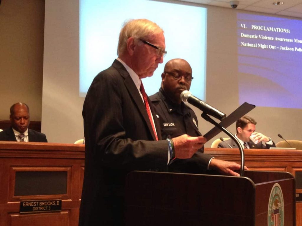 (PHOTO: Jackson Mayor Jerry Gist and Lt. Byron Taylor of the Jackson Police Department during the reading of a proclamation for National Night Out)