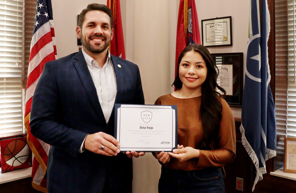 (PHOTO: Elvia Trejo, right, is named Hub City Hero for October. Jackson Mayor Scott Conger makes the presentation)