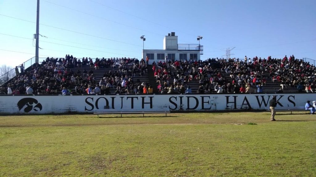 (PHOTO: Students, faculty and staff at South Side High School’s football stadium following a bomb threat)