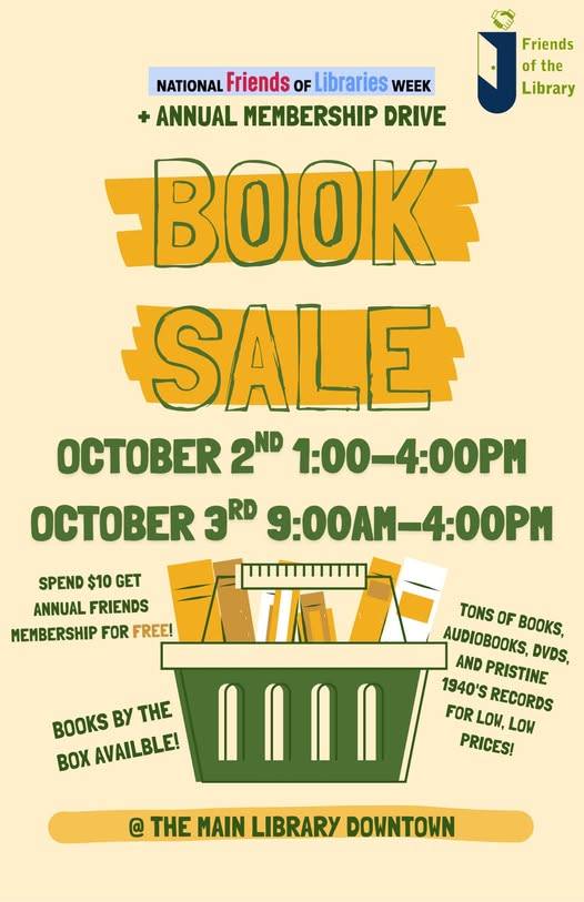 Friends of the Library Annual Membership Drive Book Sale is 1:00 pm – 4:00 pm, October 2 and 9:00 am – 4:00 pm October 3, 2025.