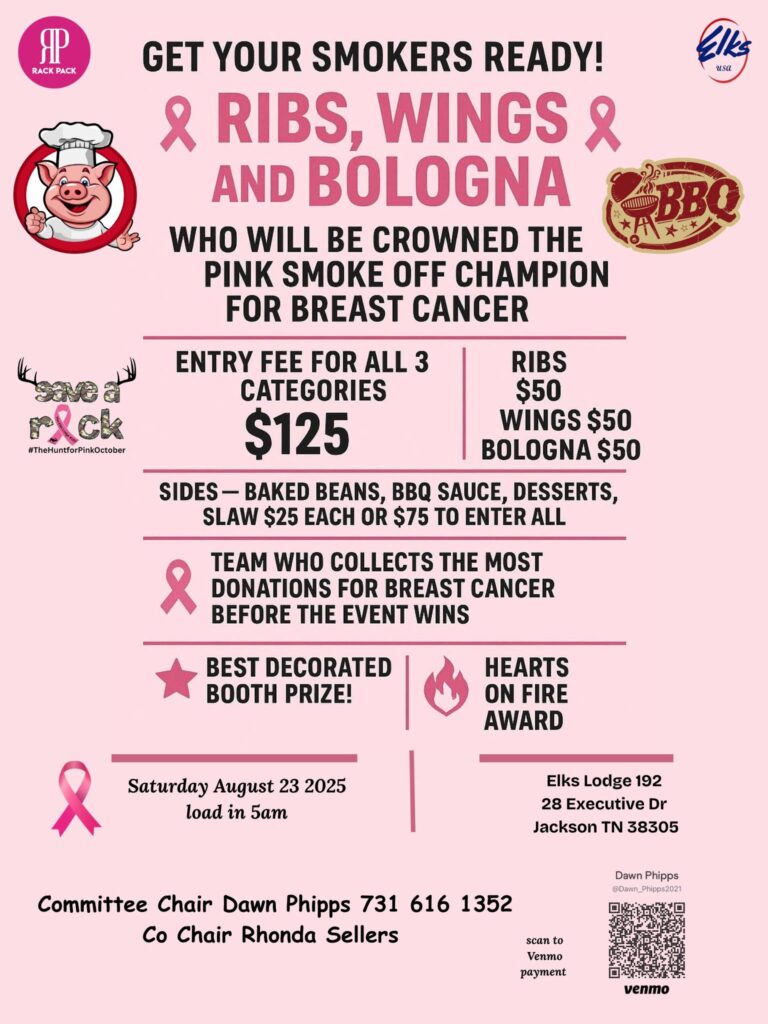 They will also be having a BBQ Pink Smoke off the same day with live music lots of fun.  Entry Fee for the all 3 categories (Ribs, Wings and Bologna) is $125.  The team who collects the most donations for breast cancer before the event wins.  Keep an eye out for the Best Decorated Booth!