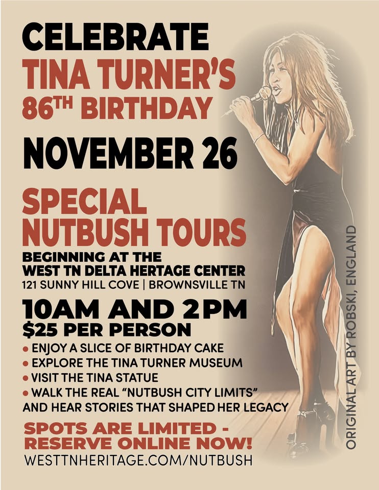On November 26, visit the West Tennessee Delta Heritage Center in Brownsville TN for a Birthday tribute to what would have been Tina Turner’s 86th birthday.