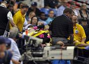 The game was delayed about 12 minutes so she could be removed on a stretcher brought onto the on-deck circle.