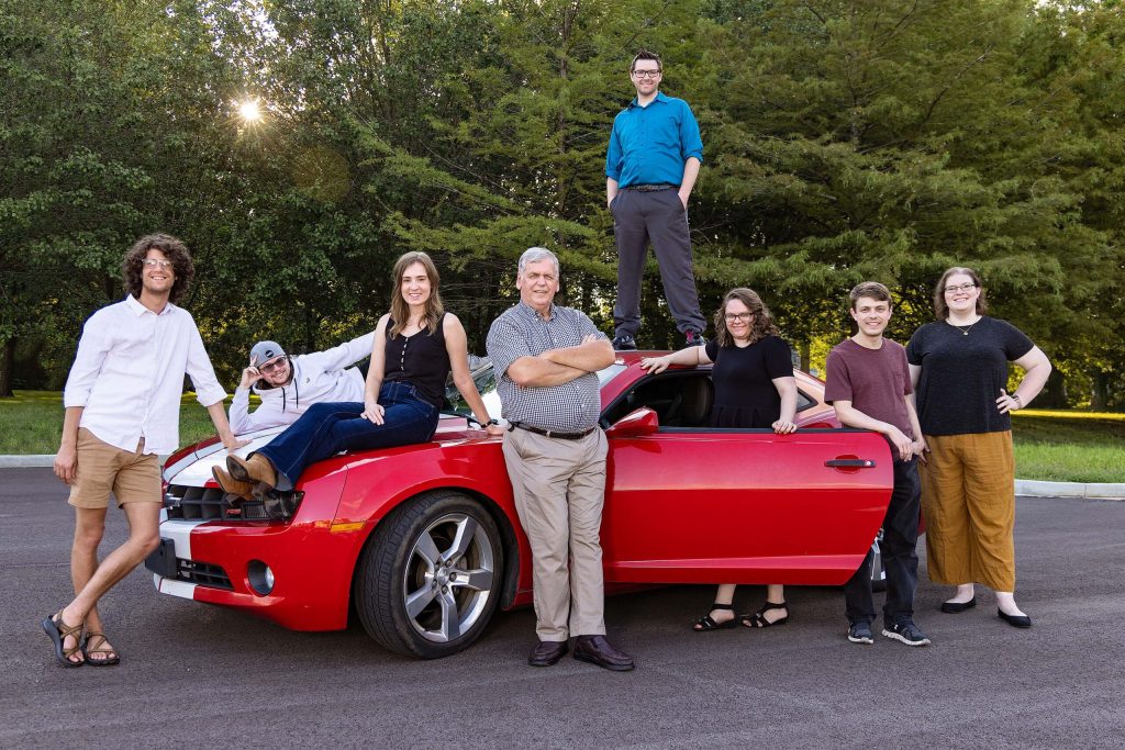 (PHOTO: The cast of “Becky’s New Car” (l to r) Jake LaJoie, Seth Wilson, Saya Eagleman, Ray Eaton, Ryan Pickens (standing on roof), Rachel Irwin (driver’s door), Kevin Record and Olivia Semore)