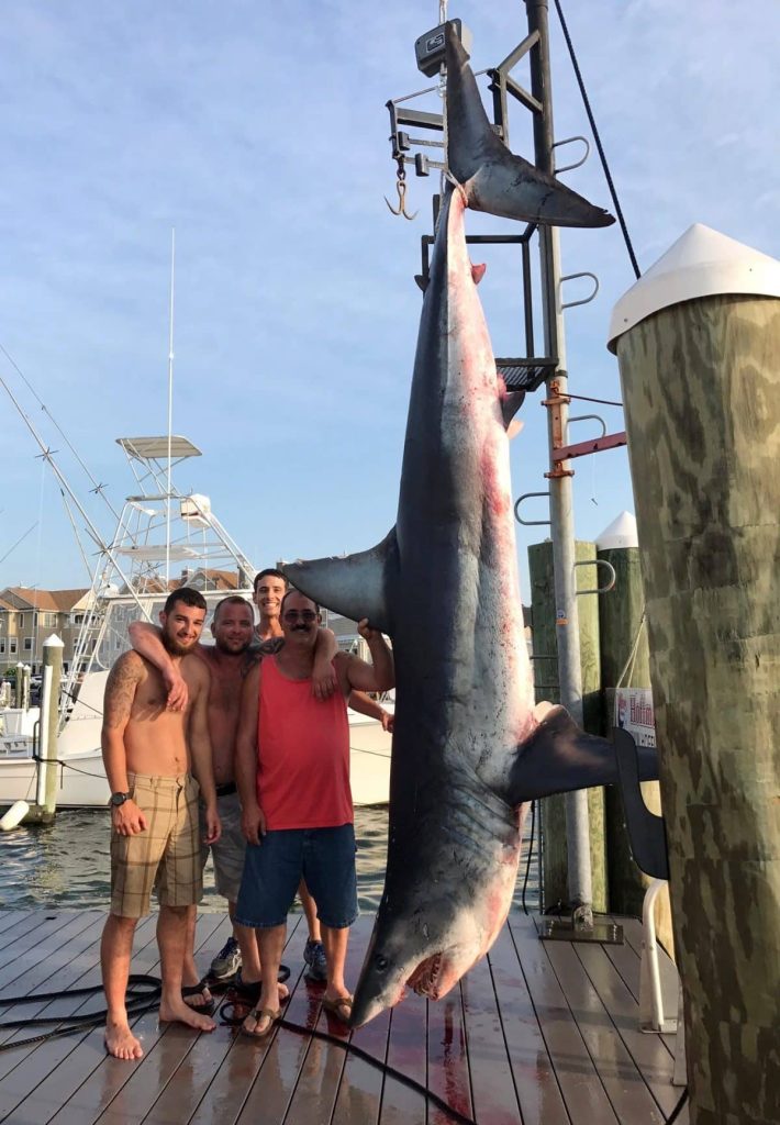 The boat’s crew was fishing about 100 miles off the coast in an area known as Hudson Canyon on Saturday. The shark was weighed and displayed in Brielle later that day.