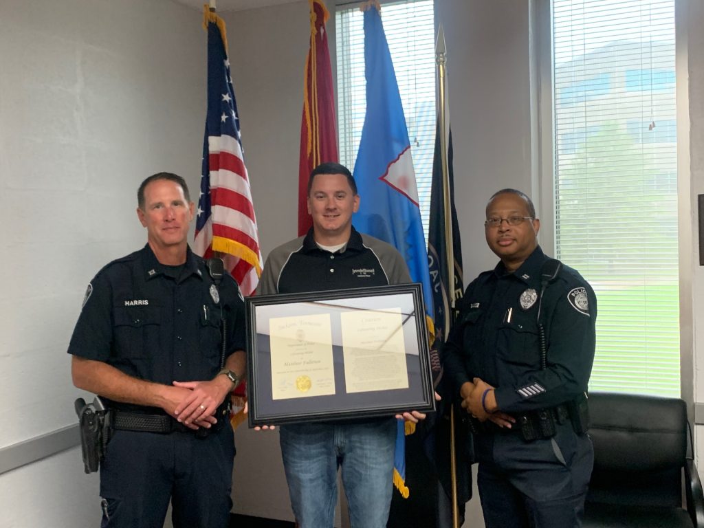 Today, July 19, 2021, Jackson Police Captain Justin Harris and Captain John Gause presented former Jackson Police Officer Matthew Fullerton with a Lifesaving Medal.