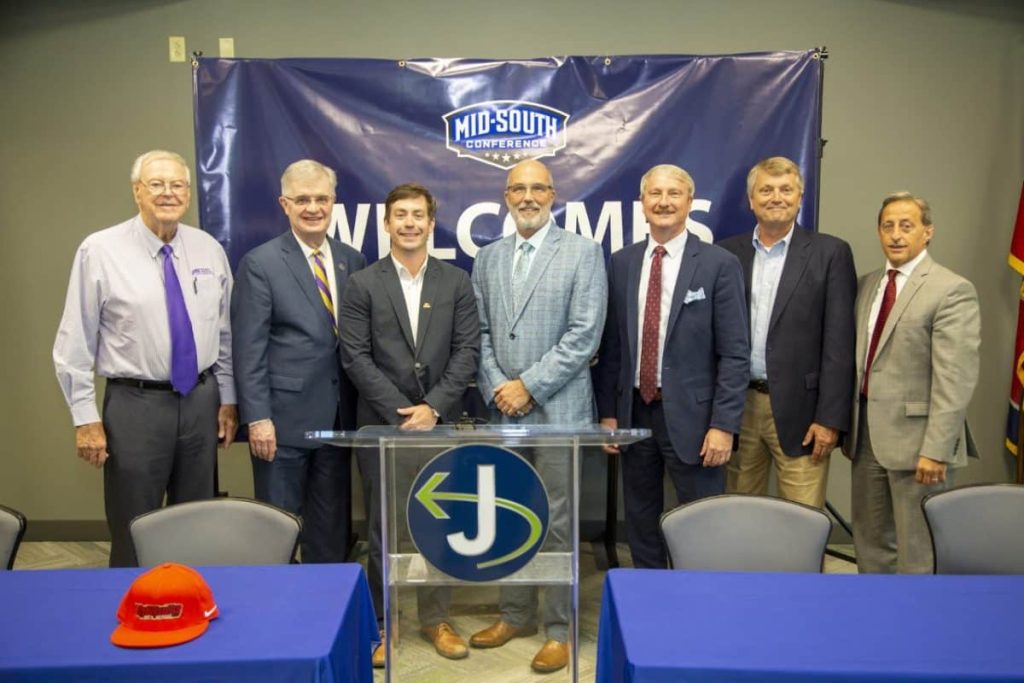 (PHOTO: Athletic Director Dale Kelley and President Walter Butler of Bethel University, Assistant Athletic Director for Communications Wade Neely of Martin Methodist College, Commissioner Eric Ward of the Mid-South Conference, President David Shannon and Athletic Director Mike McCutchen of Freed-Hardeman University and Vice President for Enrollment Management Ron Pavan of Cumberland University – courtesy The Bramblett Group)