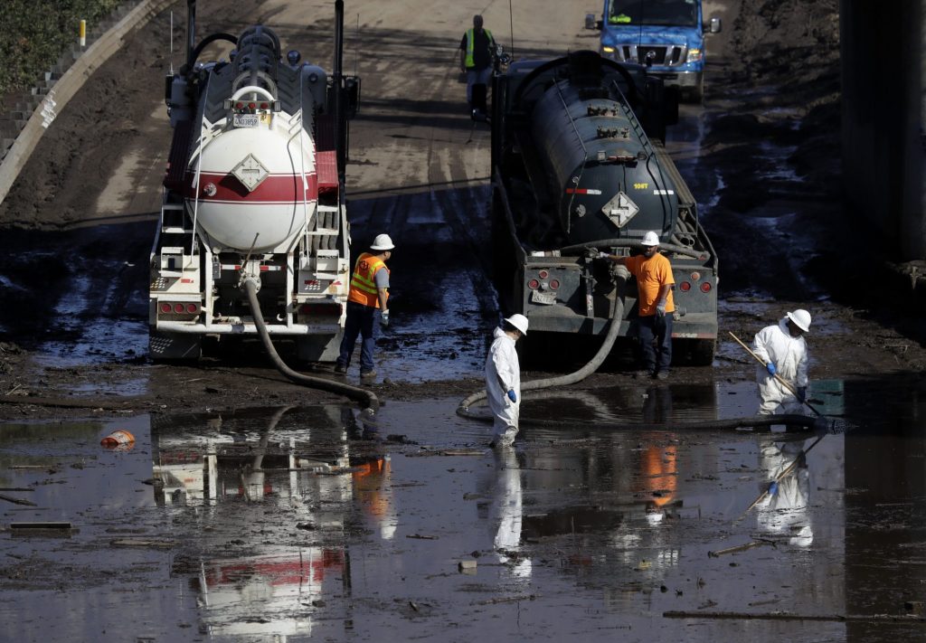 A backhoe scooped up mud and rocks around buckled and flattened homes, while bulldozers cleared roads of tangled trees, muck and boulders. Tanker trucks were being used to haul off floodwaters sucked up from U.S. Highway 101, the crippled coastal route connecting Santa Barbara to Ventura.