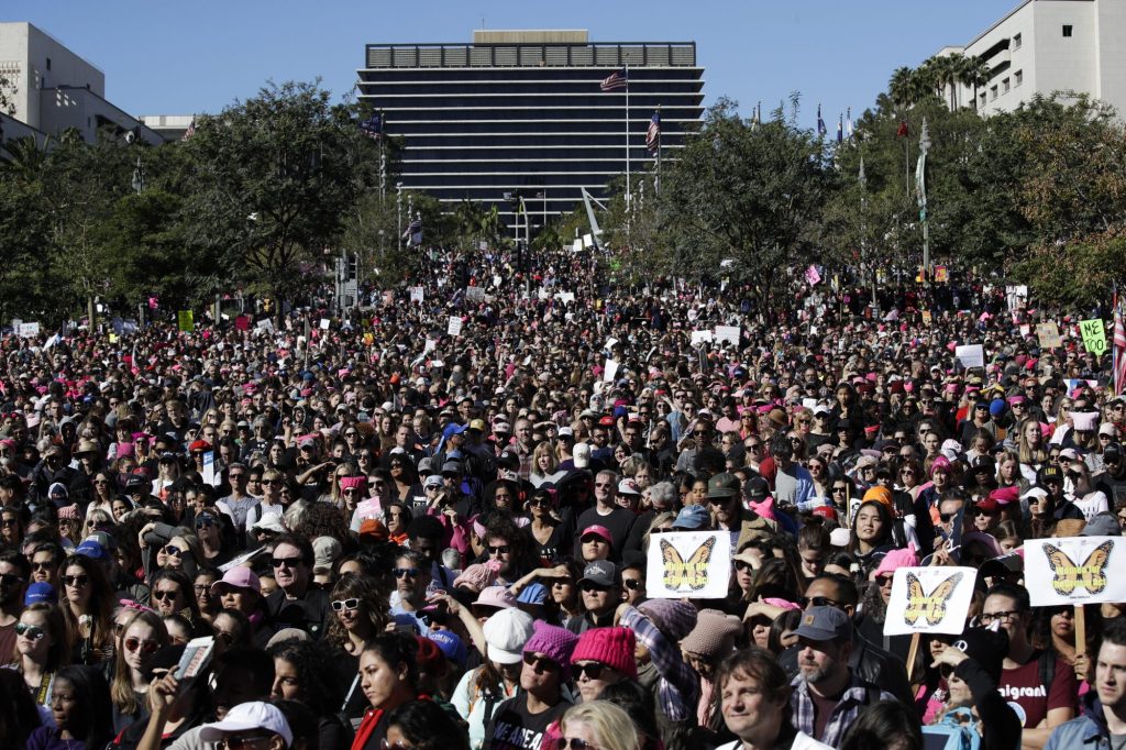 In Los Angeles, Eva Longoria, Natalie Portman, Viola Davis, Alfre Woodard, Scarlett Johansson, Constance Wu, Adam Scott and Rob Reiner were among the celebrities who addressed a crowd of hundreds of thousands of demonstrators at a women’s march.