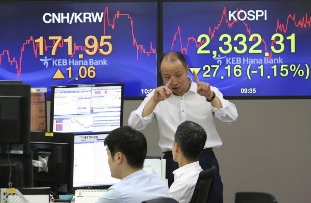 ASIA’S DAY: South Korea’s Kospi sank 1.7 percent to 2,319.71 and Hong Kong’s Hang Seng lost 2 percent to 26,883.51. Shanghai Composite Index tumbled 1.6 percent to 3,208.54. Australia’s S&P/ASX 200 dropped 1.2 percent to 5,693.10. Stocks in Taiwan, Singapore and other Southeast Asian countries were also lower. Japan was closed on a public holiday.
