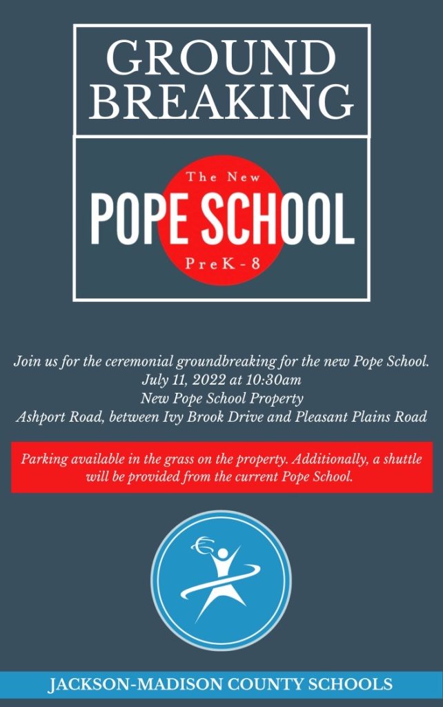 A ceremonial groundbreaking for a new Pope School – Pre K – 8th grade – will be held at 10:30 a.m., Monday, July 11, on Ashport Road between Ivy Brook Drive and Pleasant Plains Road.
