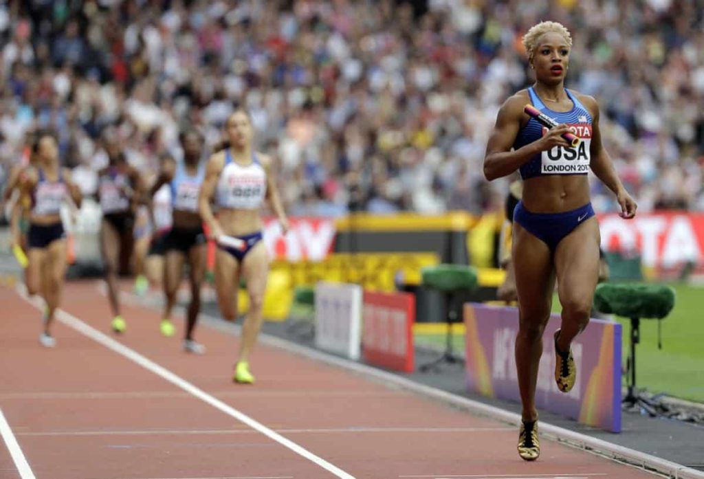 That was without even racing, when she and her American 4×400-meter teammates from 2013 were upgraded in the wake of the Russian team being stripped of first place because of doping.