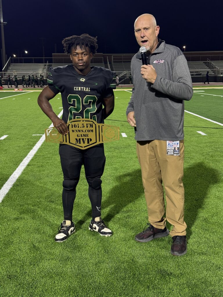 (PHOTO: Taeshon Curry, a sophomore running back at JCM is presented the high school football ‘Player of the Week’ by ‘Coach T’ Tim Stratton – Sports Director – Talk-N Sports Fox Sports WTN)