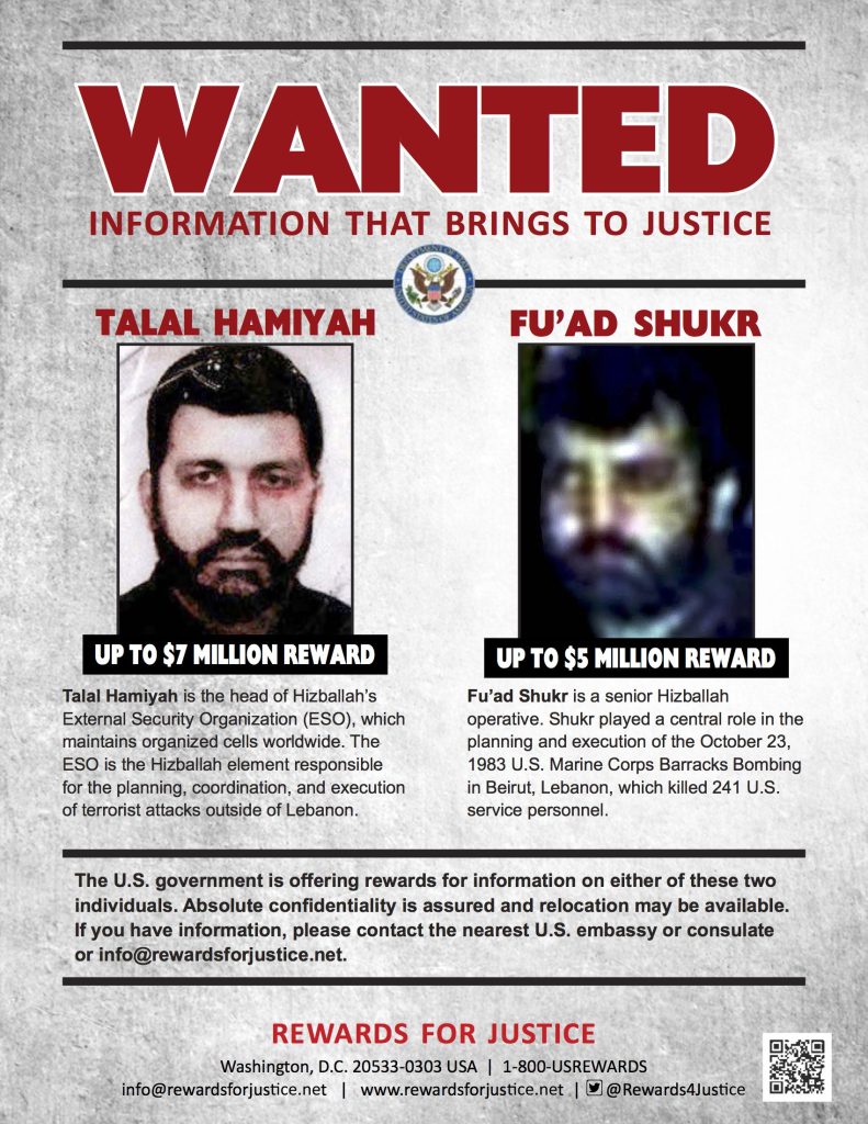 Another $5 million is being offered for information on Fuad Shukr, a member of Hezbollah who runs the group’s military forces in southern Lebanon, where the group is based. The State Department said he played a key role in Hezbollah’s recent military operations in Syria.