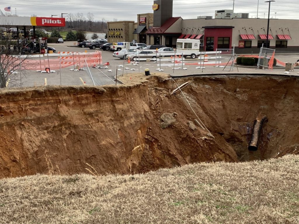 According to the City of Jackson, there is an underground pipe that has failed that runs under portions of the common area for the Sandstone Village Development and also under the Pilot property which then connects to a concrete box culvert that runs under the intersection of Christmasville Road.