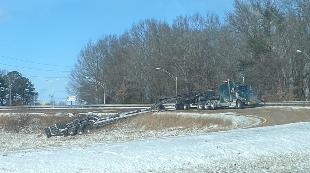 (PHOTO: Tractor trailer slides off Hollywood Drive exit from 45 Bypass – courtesy Caleb Meriwether)