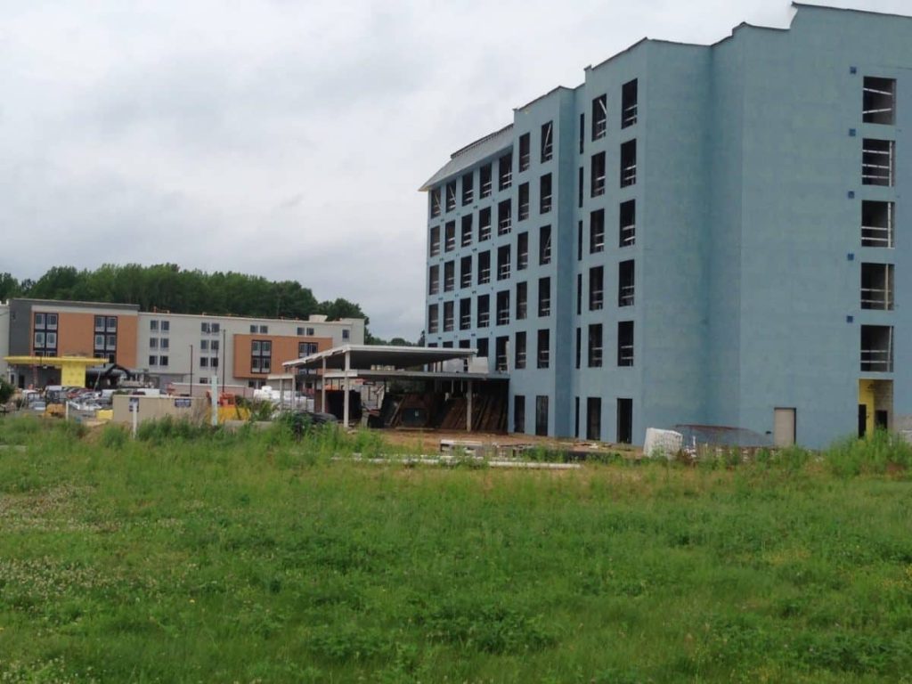 (PHOTO: Construction continues on Best Western Plus, foreground, and SpringHill Suites Marriott)