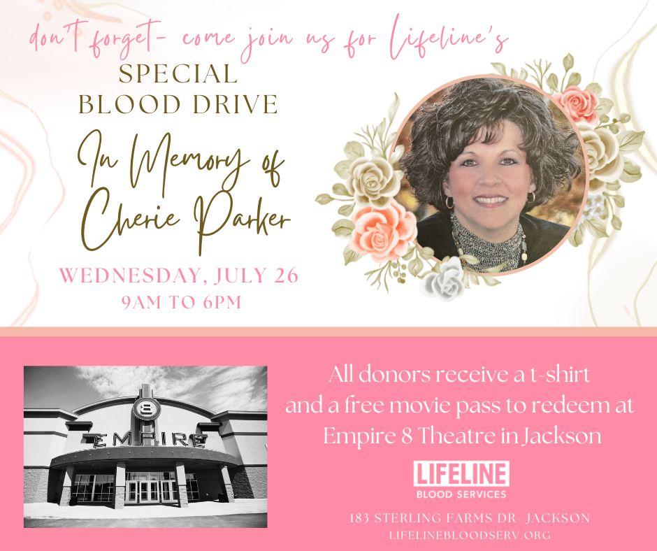 “Cherie touched so many lives in West Tennessee and she truly had a heart for serving others; by giving blood during this drive you can honor her memory and also save a life,” said Melinda Reid, Marketing Manager for LIFELINE Blood Services. “We look forward to seeing you Wednesday, July 26!”