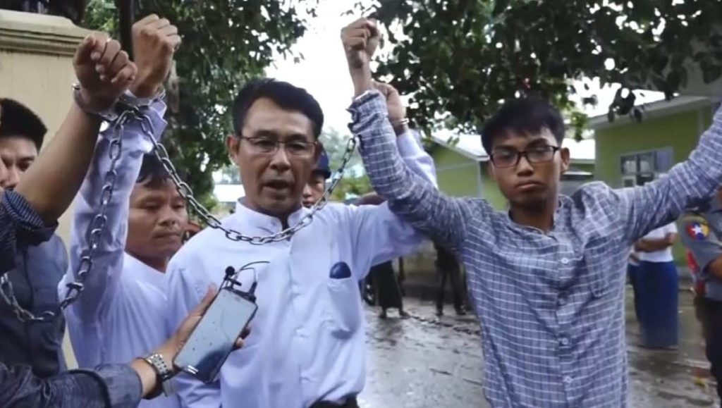 YANGON, Myanmar (AP) — In the old, military-ruled Myanmar, it would not have been a surprising scene: three journalists, bound together in chains, raising shackled hands in unison and speaking out against their repressive government.
