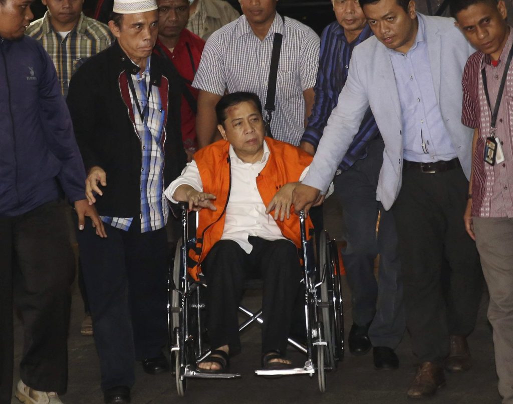 Diansyah said Novanto was moved to a detention center around midnight Sunday. Photos showed him in a wheelchair wearing the commission’s orange vest for prisoners.