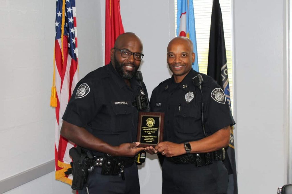 (PHOTO: Officer Joseph Mitchell receives employee of the month award from JPD Deputy Chief Tyreece Miller)