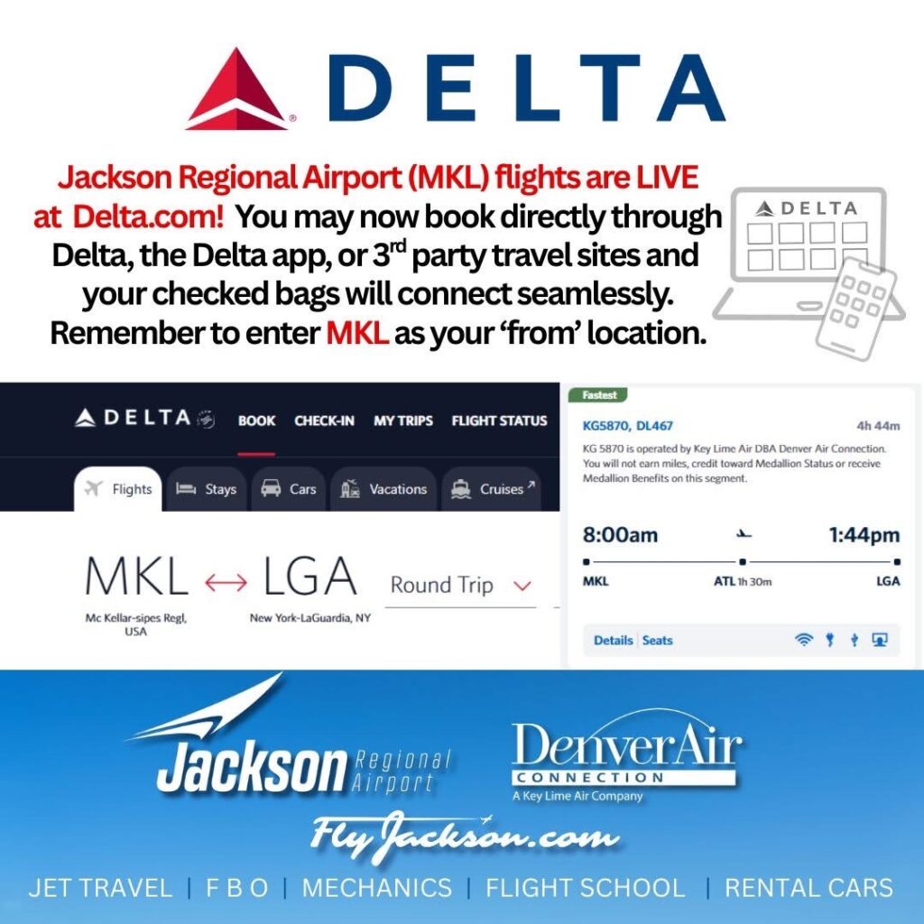 ✈️ Share it far and wide! Jackson Regional Airport (MKL) flights are live on Delta.com!