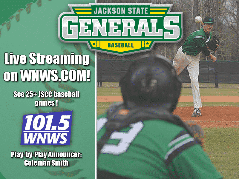 More than 25 JSCC baseball games will be streamed live on WNWS.COM with exciting play-by-play by Coleman Smith, co-host of Daybreak 6:00AM – 9:00AM on News/Talk 101.5 FM where you will also be able to hear select Generals games this season.