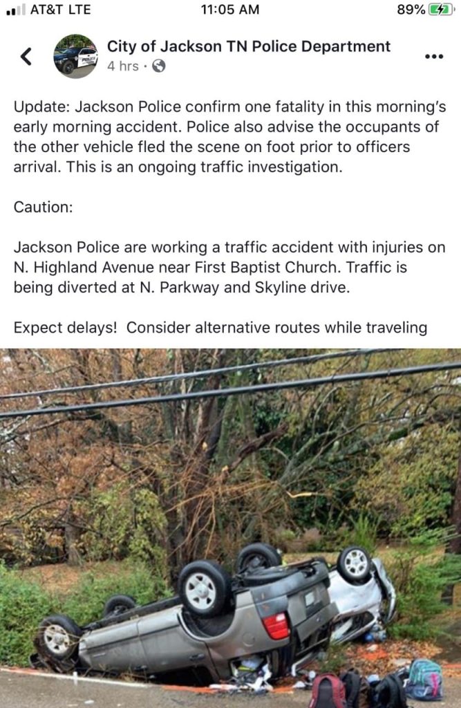 The Jackson Police Department has confirmed one fatality following an automobile accident involving two vehicles on North Highland Avenue near First Baptist Church earlier Friday.