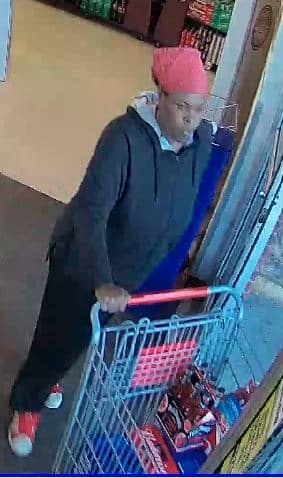 On December 7th, surveillance video captures an unknown black female who was wearing a red bandana, black Nike Hoodie, black pants and red/white shoes push a shopping cart, possessing unpaid merchandise, out the store. She was last seen leaving in a blue Chrysler Sebring.