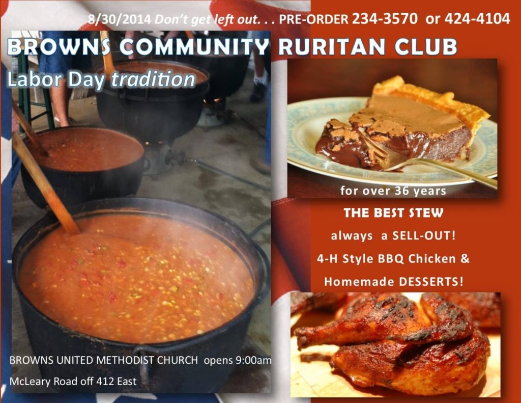Browns Ruritan Club Annual LABOR DAY Stew and BBQ Chicken Sale on Saturday, August 30 beginning at 9:00 a.m.