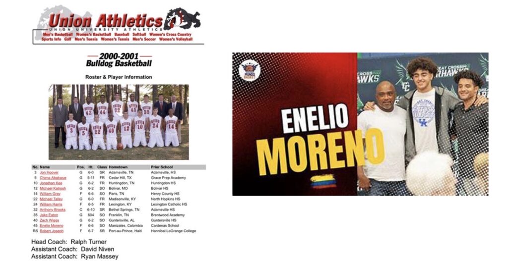 A photograph – 2000-2001 season – Union’s sports information department passed along shows Enelio, No. 45, and David Niven, second from left, back row, who is now the head basketball coach at Union.