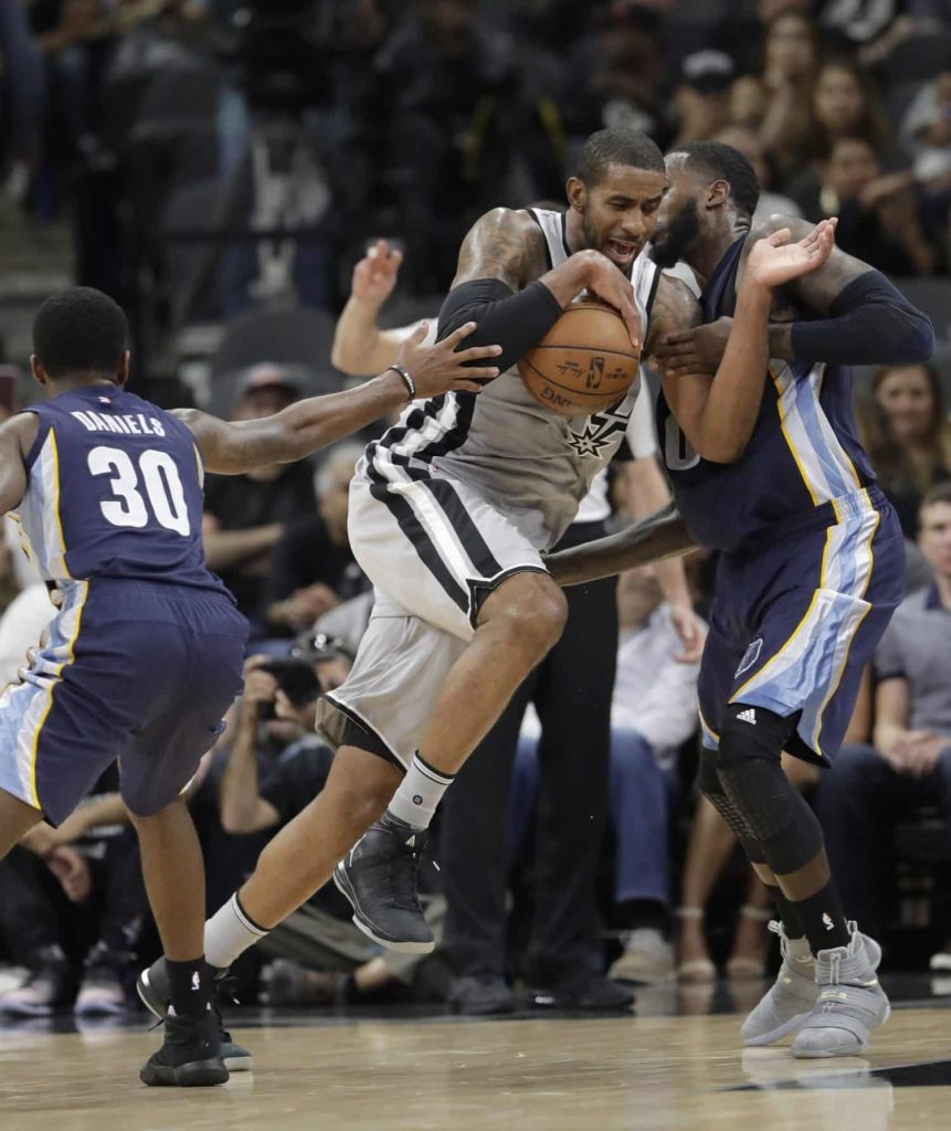 Spurs: San Antonio is 15-4 against Memphis in the postseason. … Manu Ginobili suffered a small cut under his left eye late in the first half that forced him to the locker room, but he returned for the second half. … The Spurs have opened the postseason on the road just twice in 15 years since moving into the AT&T Center in 2003. … Ginobili has 309 3-pointers in his postseason career, third behind Ray Allen (385) and Reggie Miller (320) in league history.