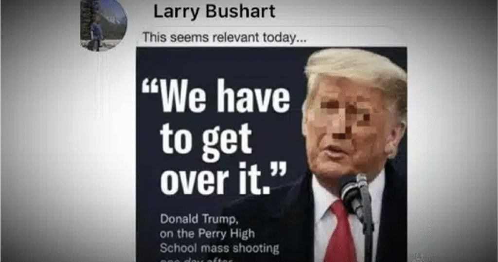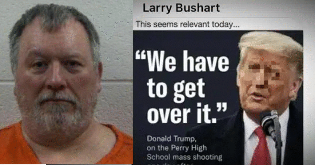 A Tennessee man, Larry Bushart, 61, from Lexington, has been jailed for over a month and faces a $2 million bond for posting a Donald Trump meme on Facebook. The meme, shared in a group discussing a local Charlie Kirk vigil, featured a Trump quote from January 2024 about a Perry, Iowa, school shooting, saying, “We have to get over it,” with Bushart noting its relevance. Hours later, Perry County sheriff’s deputies, from 45 minutes away, arrested him on September 22, charging him with “threatening mass violence at a school.”