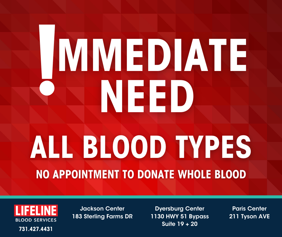 JACKSON, TN – An immediate need for all blood types has been announced by Lifeline Blood Services today. Lifeline is in need of donors willing to roll up their sleeves as soon as possible.